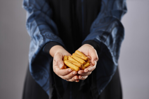 A Saudi woman having a Call in a blue background wearing blue Abaya with hijab