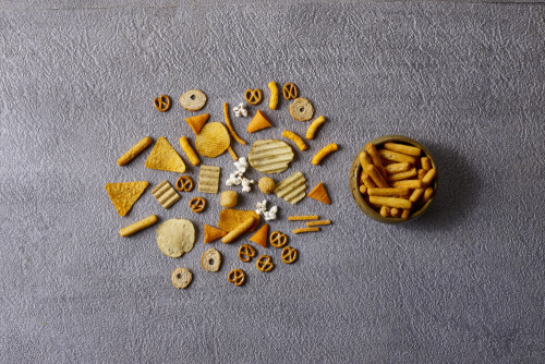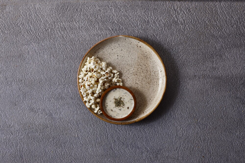 وجبات خفيفة متنوعة في أوعية فخارية على خلفية رمادية