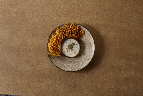 وجبات خفيفة متنوعة على طبق فخاري مع غموس على خلفية بنية