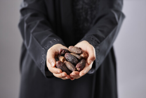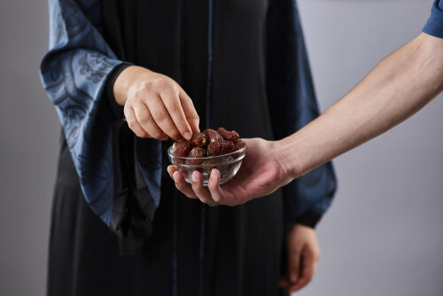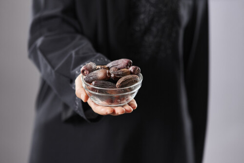 امرأة ترتدي عباءة تحمل أنواع مختلفة من التمر في أوضاع متعددة
