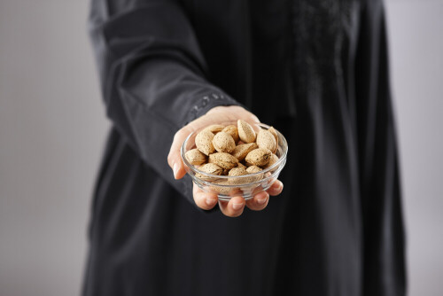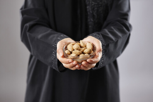 امرأة ترتدي عباءة تحمل أنواع مختلفة من المكسرات في أوضاع متعددة