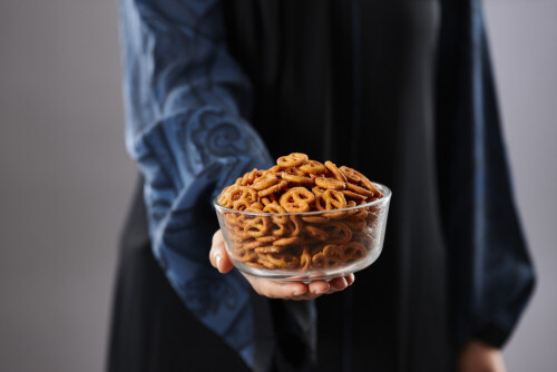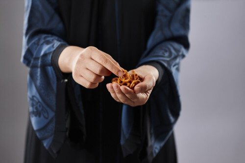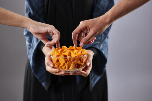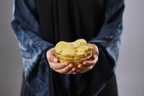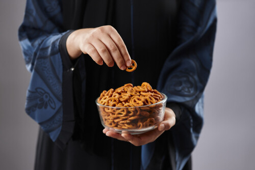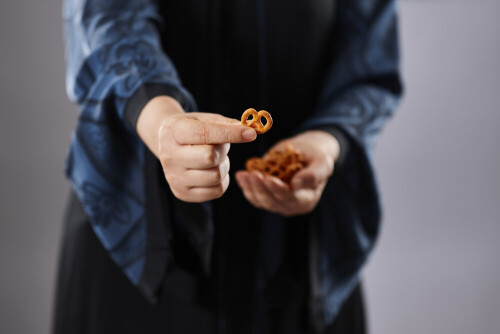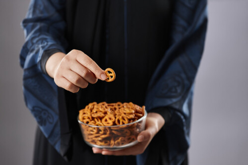 امرأة ترتدي عباءة تحمل أنواع مختلفة من الوجبات الخفيفة في أوضاع متعددة