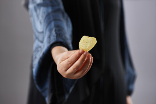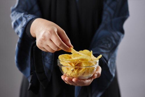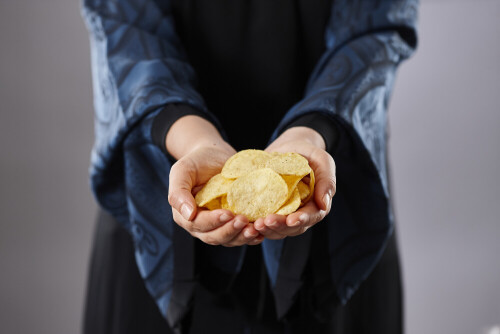 امرأة ترتدي عباءة تحمل أنواع مختلفة من الوجبات الخفيفة في أوضاع متعددة