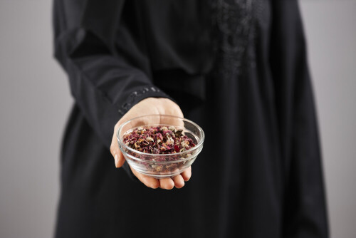 امرأة ترتدي عباءة تحمل أنواع مختلفة من البهارات في أوضاع متعددة