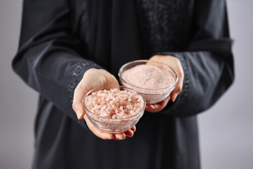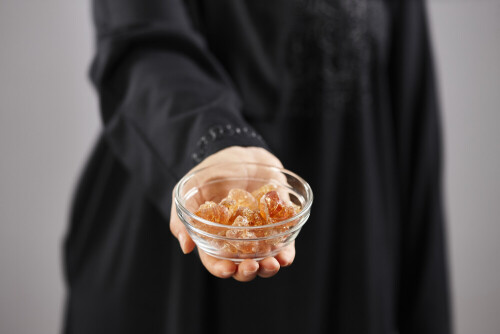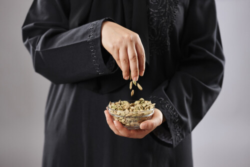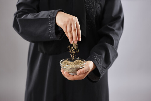 امرأة ترتدي عباءة تحمل أنواع مختلفة من البهارات في أوضاع متعددة
