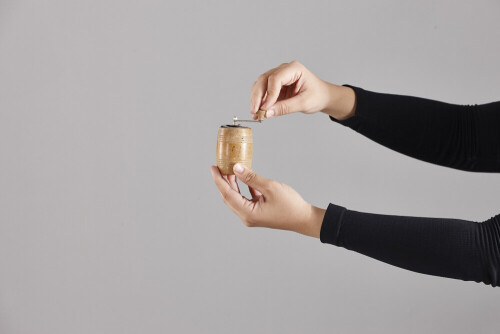 امرأة ترتدي عباءة سوداء تحمل أدوات خشبية مختلفة في أوضاع متعددة