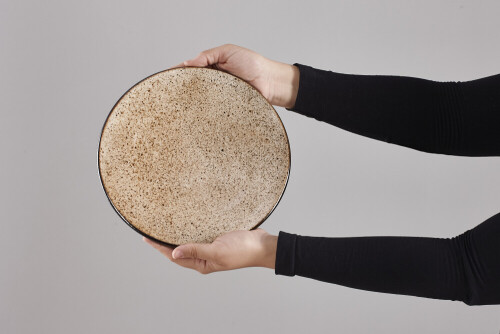 امرأة ترتدي عباءة سوداء تحمل أدوات فخارية مختلفة في أوضاع متعددة