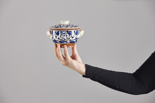 امرأة ترتدي عباءة سوداء تحمل أدوات فخارية مختلفة في أوضاع متعددة
