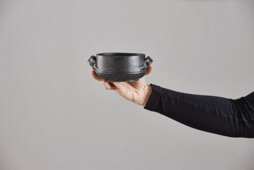 امرأة ترتدي عباءة سوداء تحمل أدوات فخارية مختلفة في أوضاع متعددة