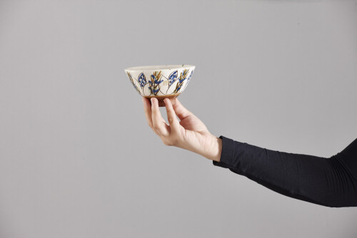 A Saudi woman having a call in a blue background wearing offwhite Abaya Hijab