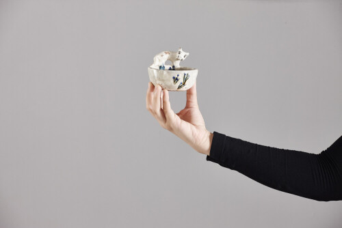 A woman in black abaya holding different pottery essentials in different positions
