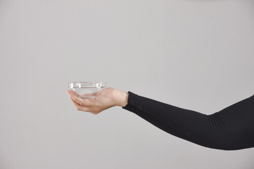 A woman in black abaya holding different glassware in different positions