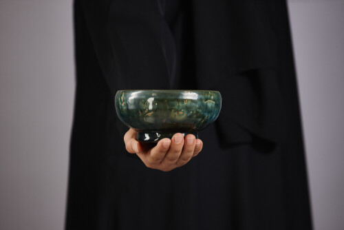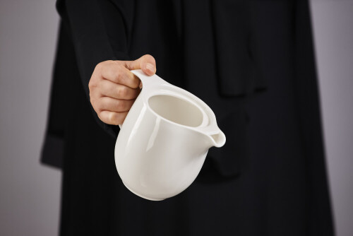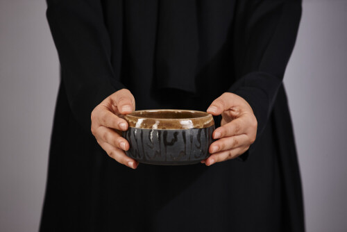 A woman in black abaya holding different pottery essentials in different positions