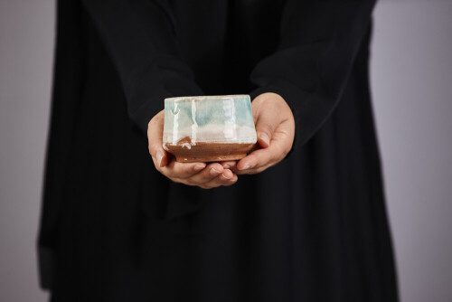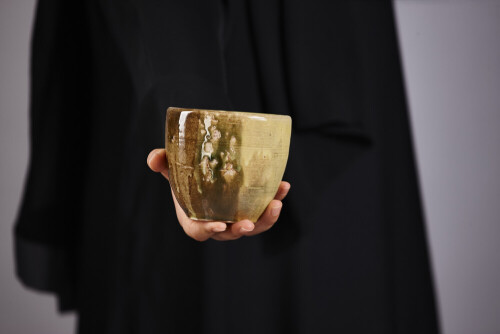 A woman in black abaya holding different pottery essentials in different positions