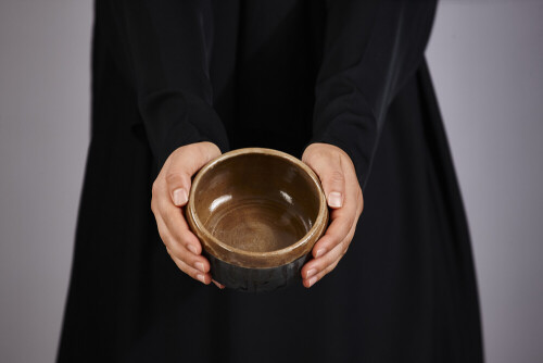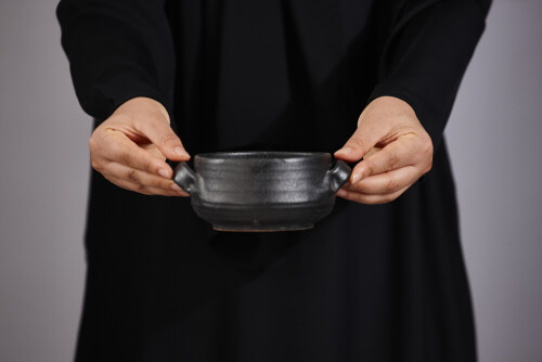 A woman in black abaya holding different pottery essentials in different positions