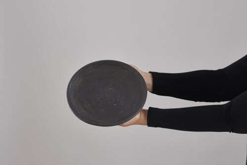 A woman in black abaya holding different pottery essentials in different positions