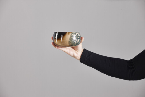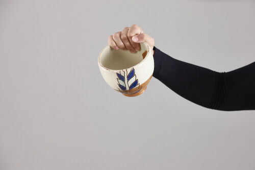 A woman in black abaya holding different pottery essentials in different positions