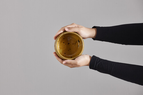 A woman in black abaya holding different pottery essentials in different positions