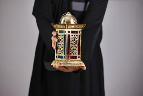 A woman in black abaya holding different ramadan lanterns in different positions