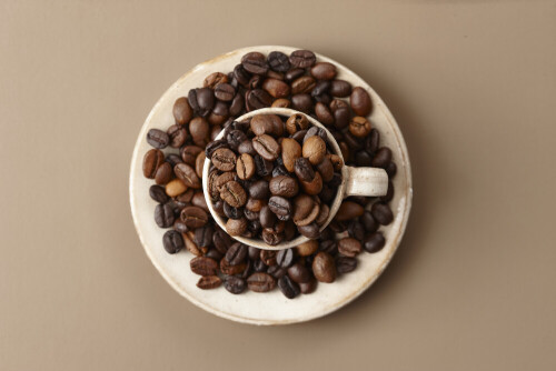 A beige pottery cup full of roasted coffee beans on beige background