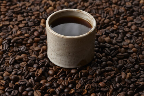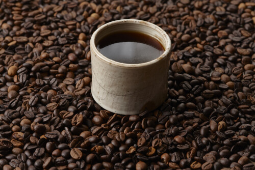A beige pottery cup of coffee surrounded by roasted coffee beans on beige background