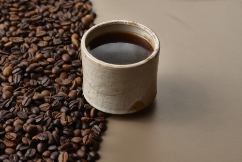 A beige pottery cup of coffee surrounded by roasted coffee beans on beige background