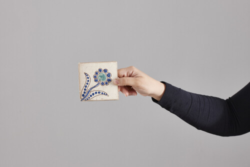 multi-colored pottery Plate placed on a small light colored straw placemat