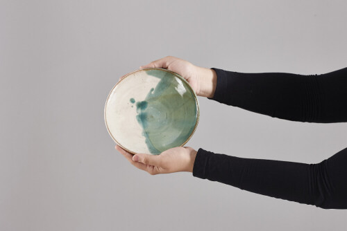 Multicolored Pottery Oven Plate with wooden honey handle in it