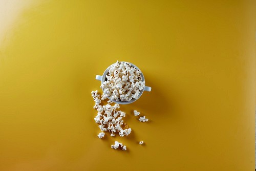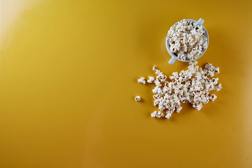 A white ceramic bowl full of popcorn with popcorn beside it on a yellow background in a top view shot