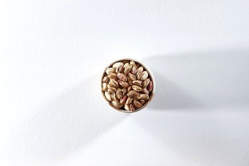 وعاء زجاجي ممتلئ بحبوب الفستق المقشر على خلفية بيضاء
