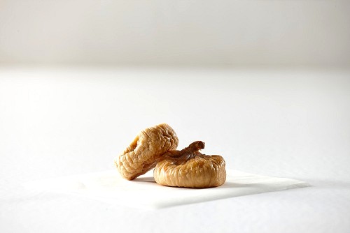 حبة واحدة من التين المجفف على قطعة من الورق على خلفية بيضاء