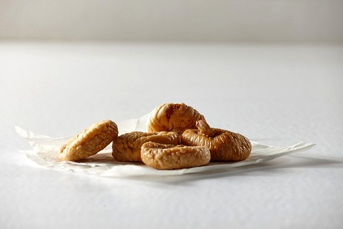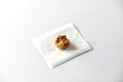 حبة واحدة من التين المجفف على قطعة من الورق على خلفية بيضاء