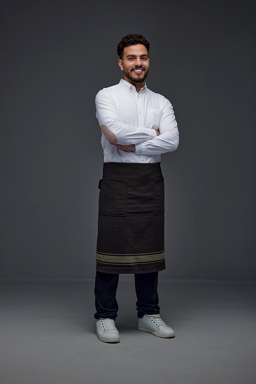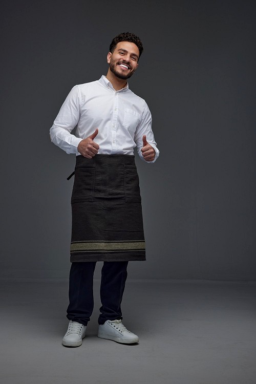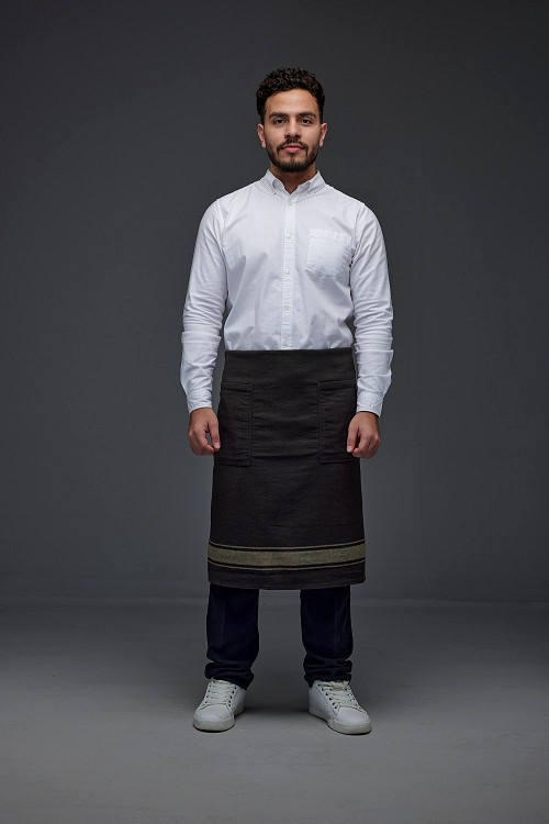 A man wearing smart casual and apron standing and making multi poses eye level on a gray background