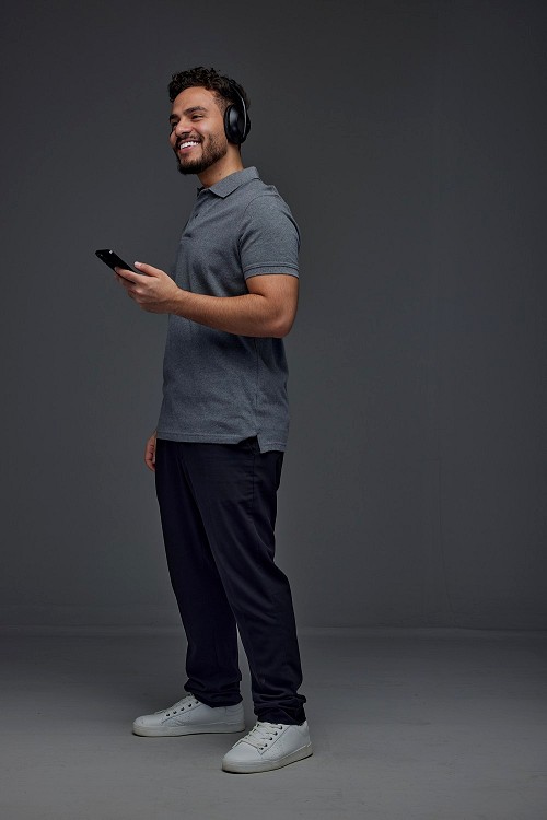 A man wearing casual and using his phone and headphone eye level on a gray background