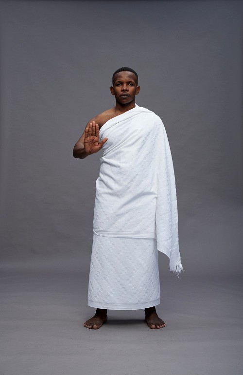 A man wearing Ehram Standing Interacting with the camera on gray background
