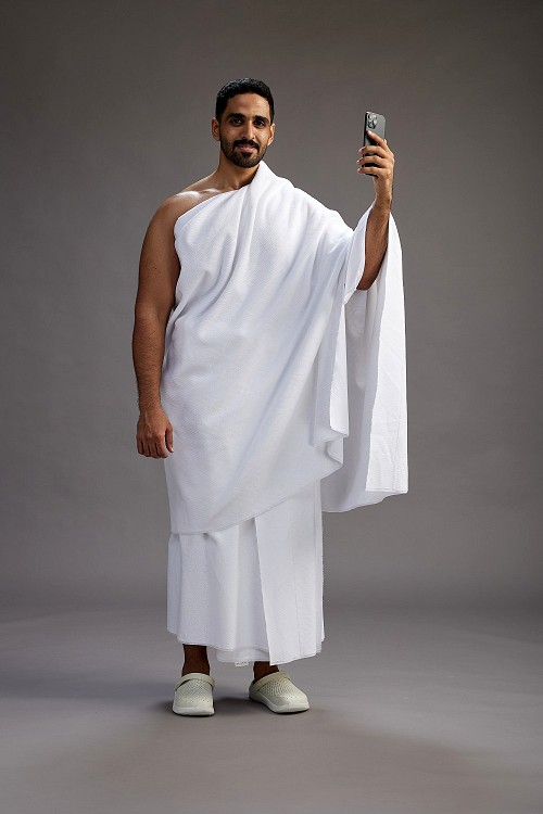 A man wearing Ehram Standing taking selfie on gray background