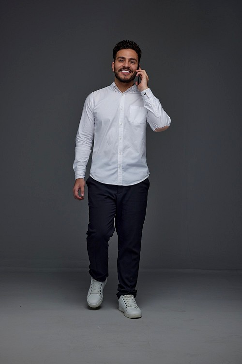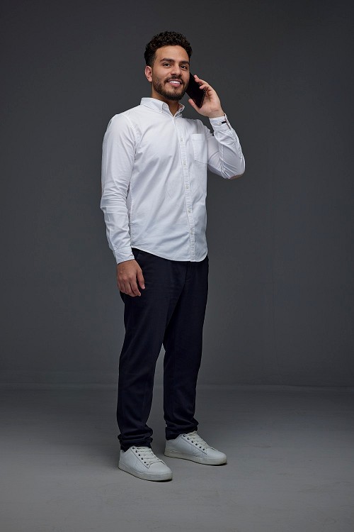 A man wearing smart casual talking in the phone eye level on a gray background