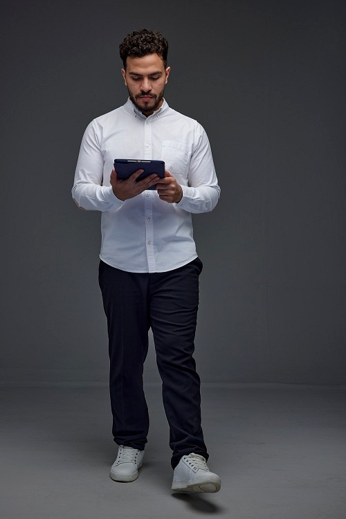 A man wearing smart casual standing and using his tablet eye level on a gray background