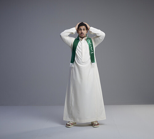 رجل سعودي يرتدي ثوب ابيض و شال يتفاعل مع الكاميرا