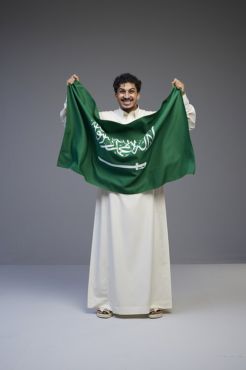رجل سعودي يرتدي ثوب ويحمل علم السعودية