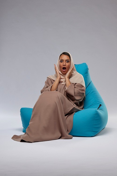 A woman sitting on a blue beanbag and interacting with the camera