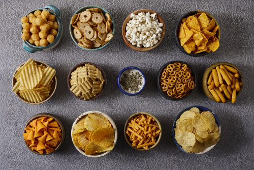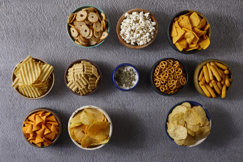 وجبات خفيفة متنوعة في أوعية فخارية على خلفية رمادية