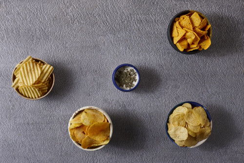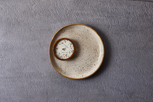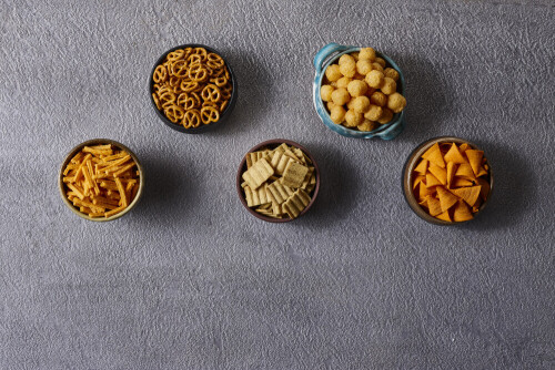 وجبات خفيفة متنوعة في أوعية فخارية على خلفية رمادية