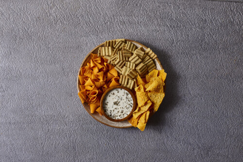 وجبات خفيفة متنوعة في أوعية فخارية على خلفية رمادية