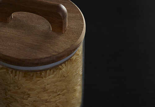 أرز بسمتي في وعاء زجاجي على خلفية سوداء