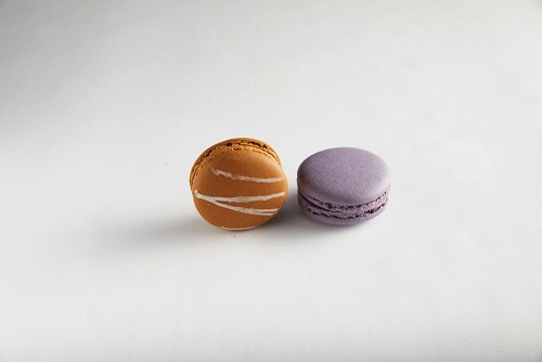 45º Shot of of two assorted Brown Irish Cream, and Purple Blueberry macarons on white background