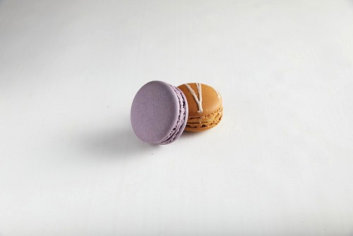 45º Shot of of two assorted Brown Irish Cream, and Purple Blueberry macarons on white background