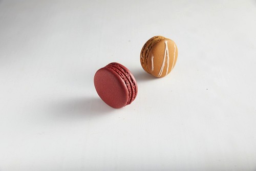 45º Shot of of two assorted Brown Irish Cream, and Red Velvet macarons on white background