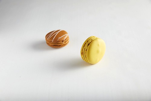 45º Shot of of two assorted Brown Irish Cream, and Yellow Lemon macarons on white background