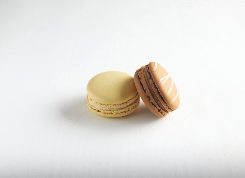45º Shot of of two assorted Brown Irish Cream, and Yellow Vanilla macarons on white background